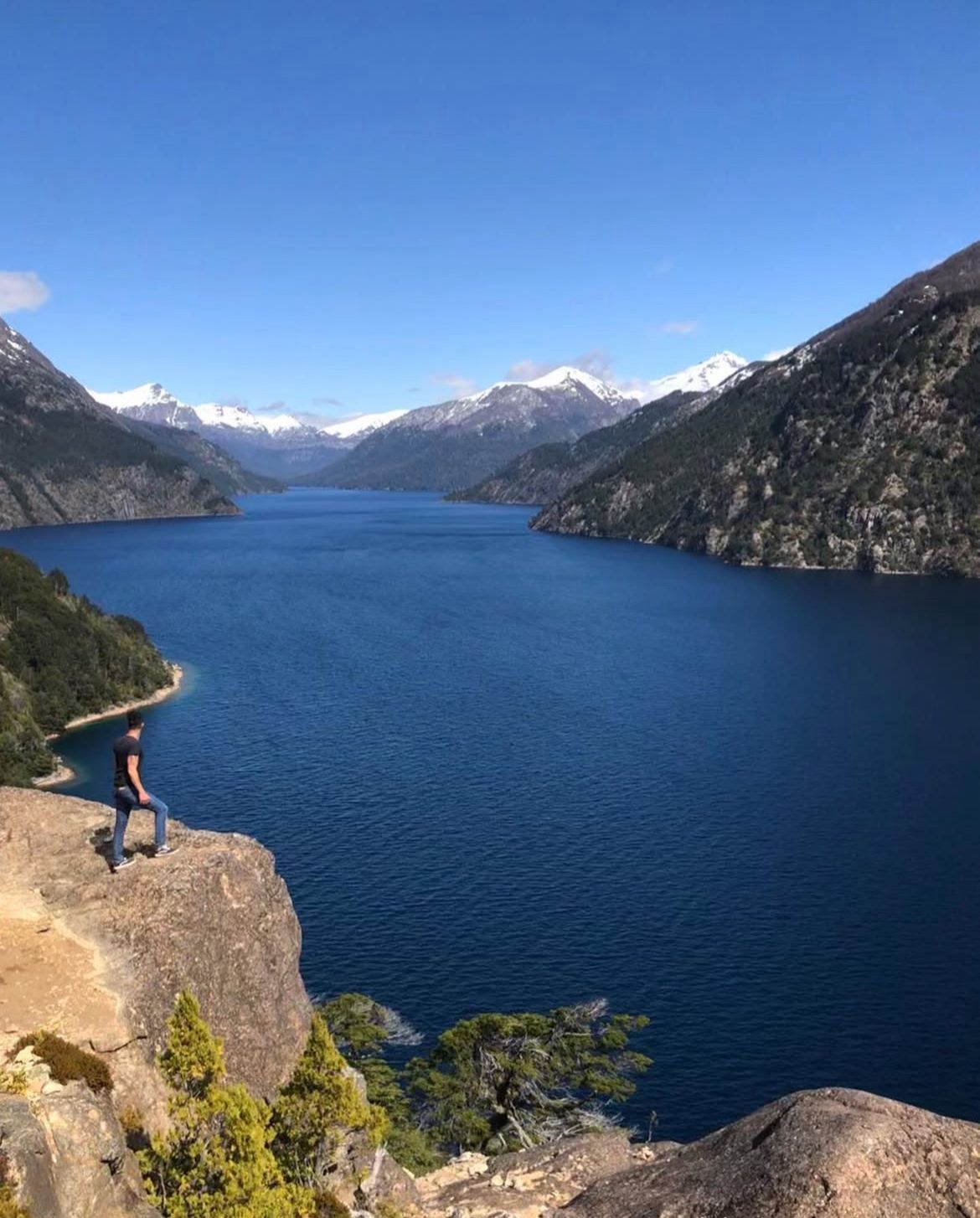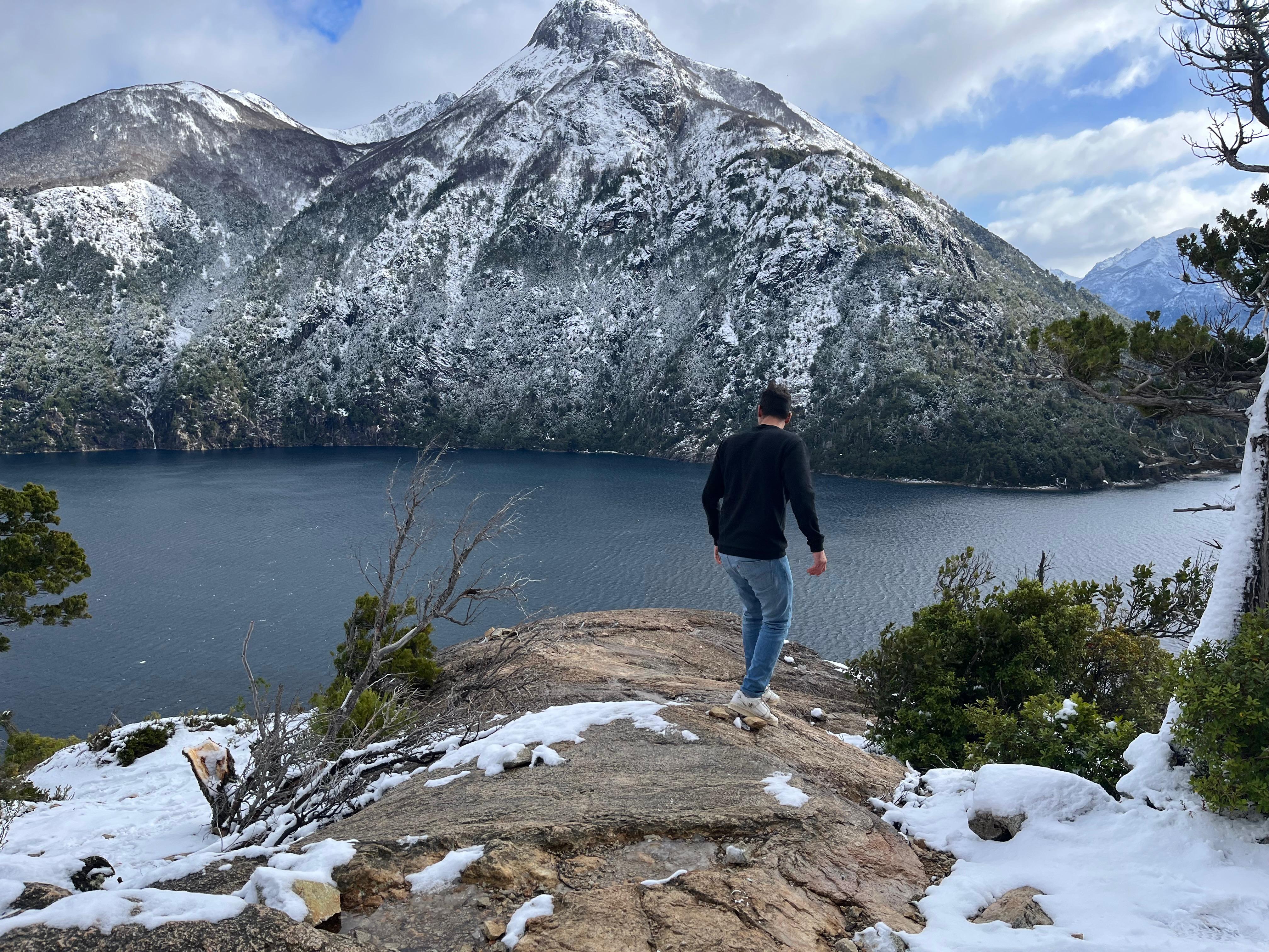 Observación del contraste entre lago y cumbres blancas