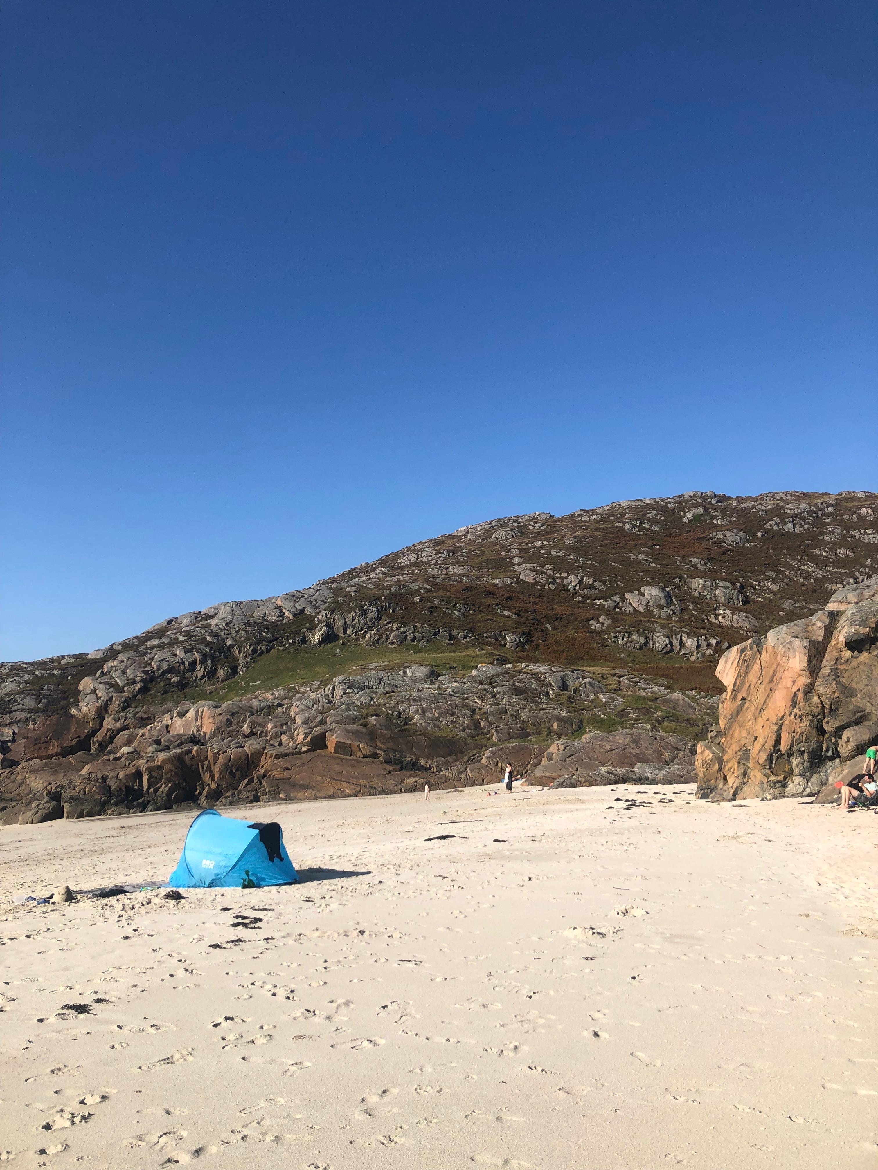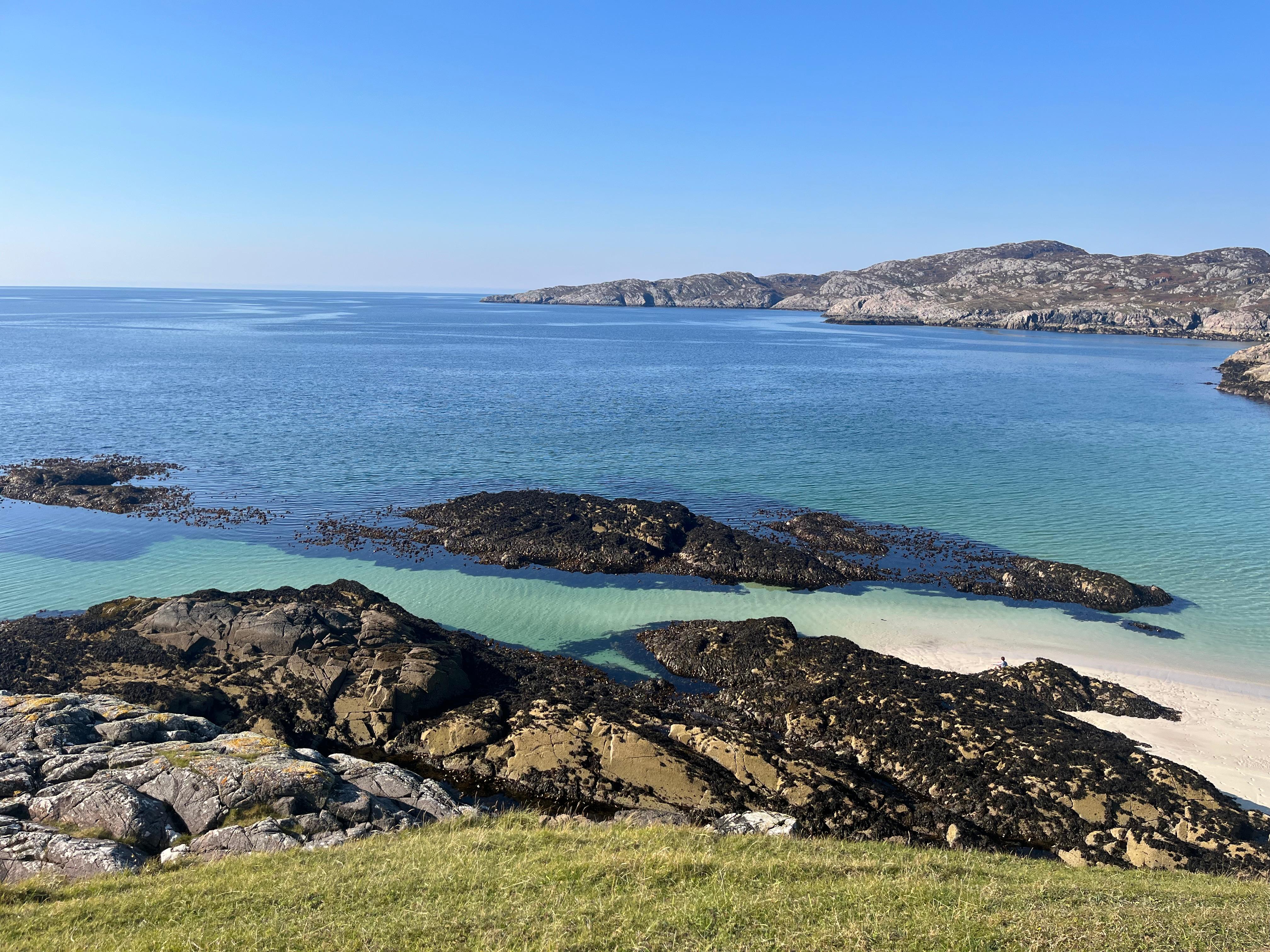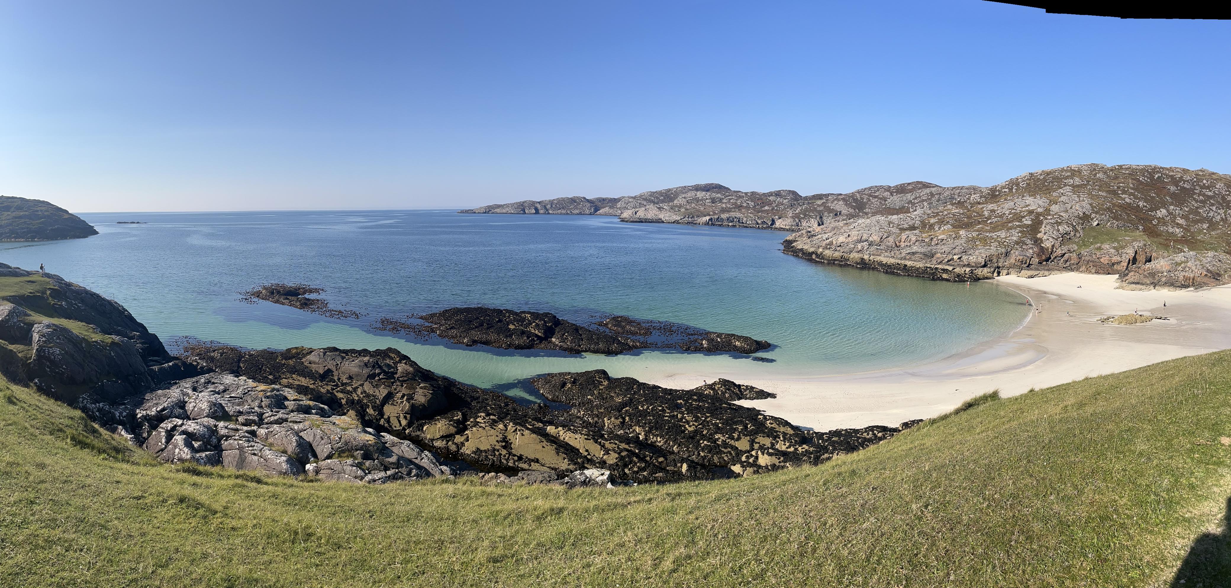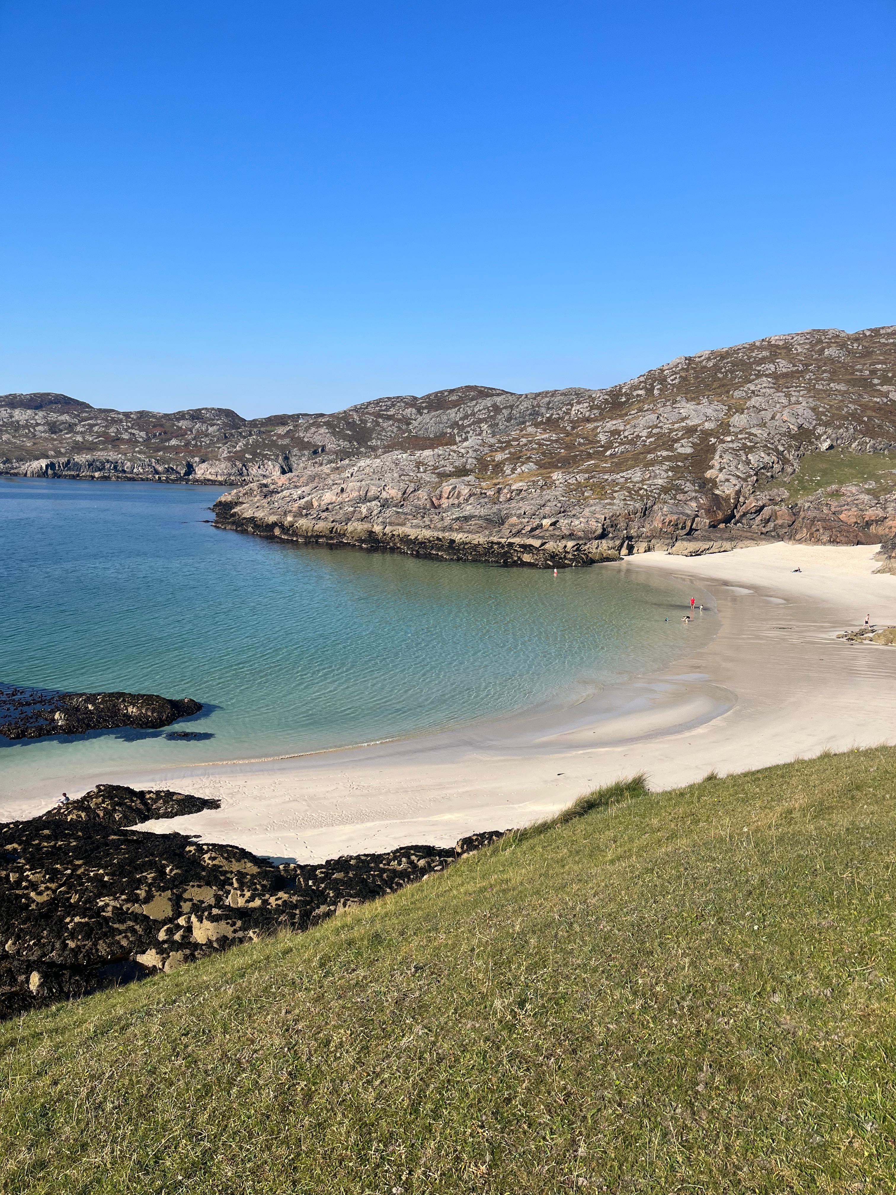 Ubicada en el corazón de Assynt, Achmelvich no parece una playa escocesa, sino un rincón del Caribe perdido en el norte. Con su arena blanca de conchas trituradas y aguas de un azul eléctrico, es el refugio favorito de campistas, amantes de la naturaleza y buscadores de paz en la ruta NC500.